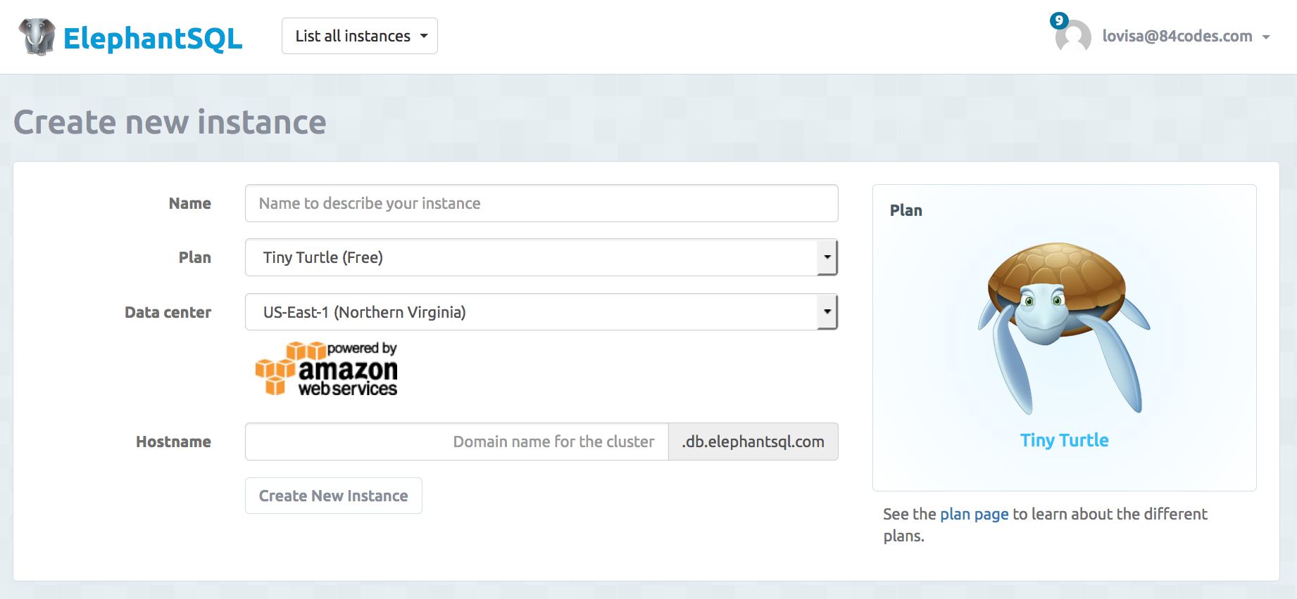 - Plan: The plan you would like to have. Tiny Turtle is the name of the free plan.