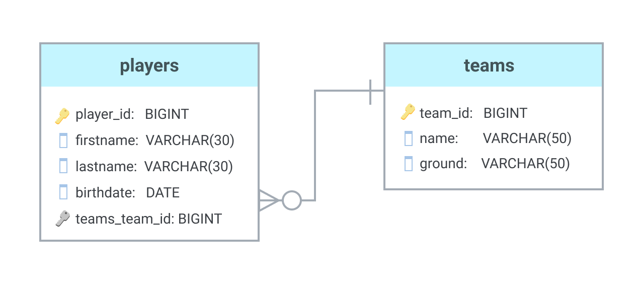 The relationships between the entities need to be defined, and the cardinality of each relationship. The cardinality shows how one side of the relationship (e.g. players) belongs to the other side of the relationship (e.g. teams). One player can, in this case, belong to one and only one team while one team could include many different players. This creates a many-to-1 relation.
